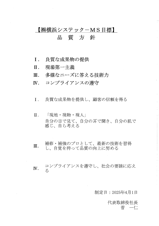 当社はマネジメントシステムの基本方針に基づき、品質力・技術力の向上に努め、お客様に満足していただける成果物を提供すると共に、建設業界の発展に貢献することを宣言します。